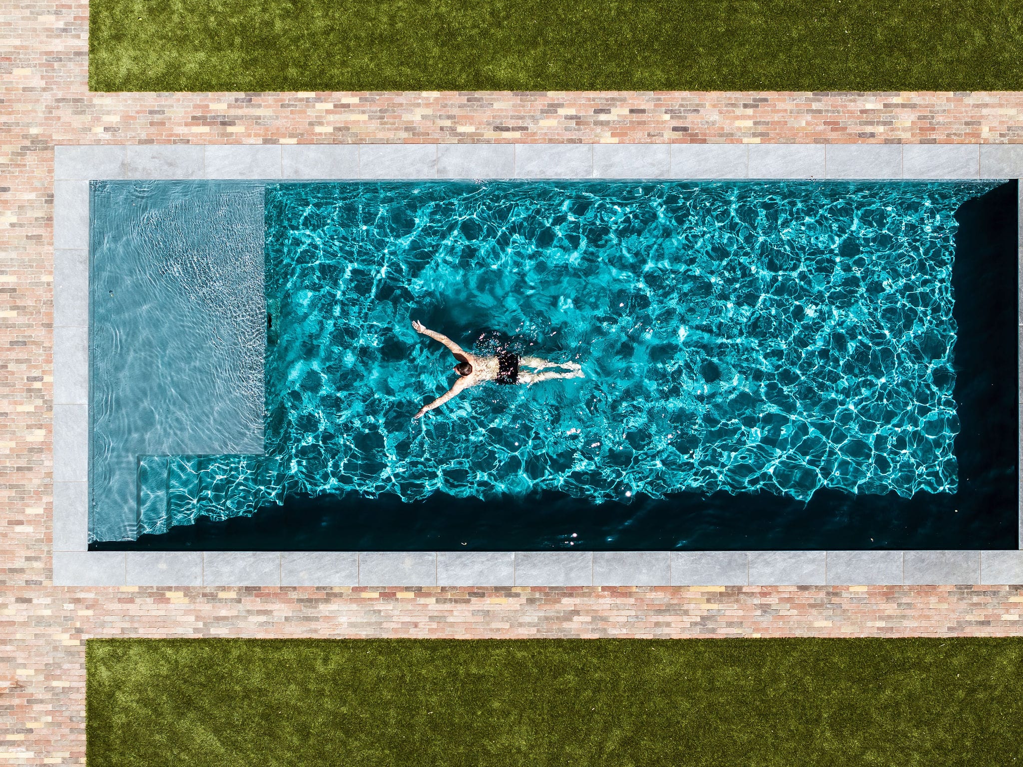 Een modern, luxe zwembad afgewerkt met mozaïek